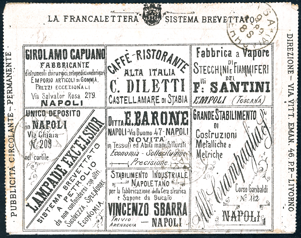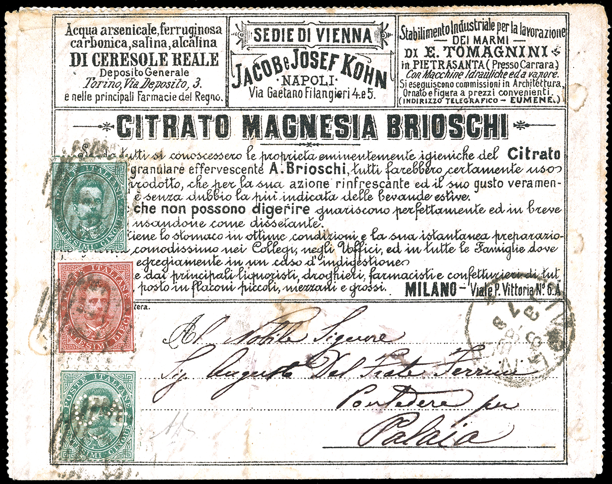 FRANCALETTERE 1889 - 4 cent. su 5 cent. Umberto I (2), dentellatura leggermente rifilata in basso, in affrancatura mista con 5 cent. e 10 cent. Umberto I (37,38), perfetti, su busta francalettere da Livorno 9/3/1889 a Palaia. Eccezionale affrancatura mista con valori gemelli da 5 cent., estremamente rara. Cert. Diena.
