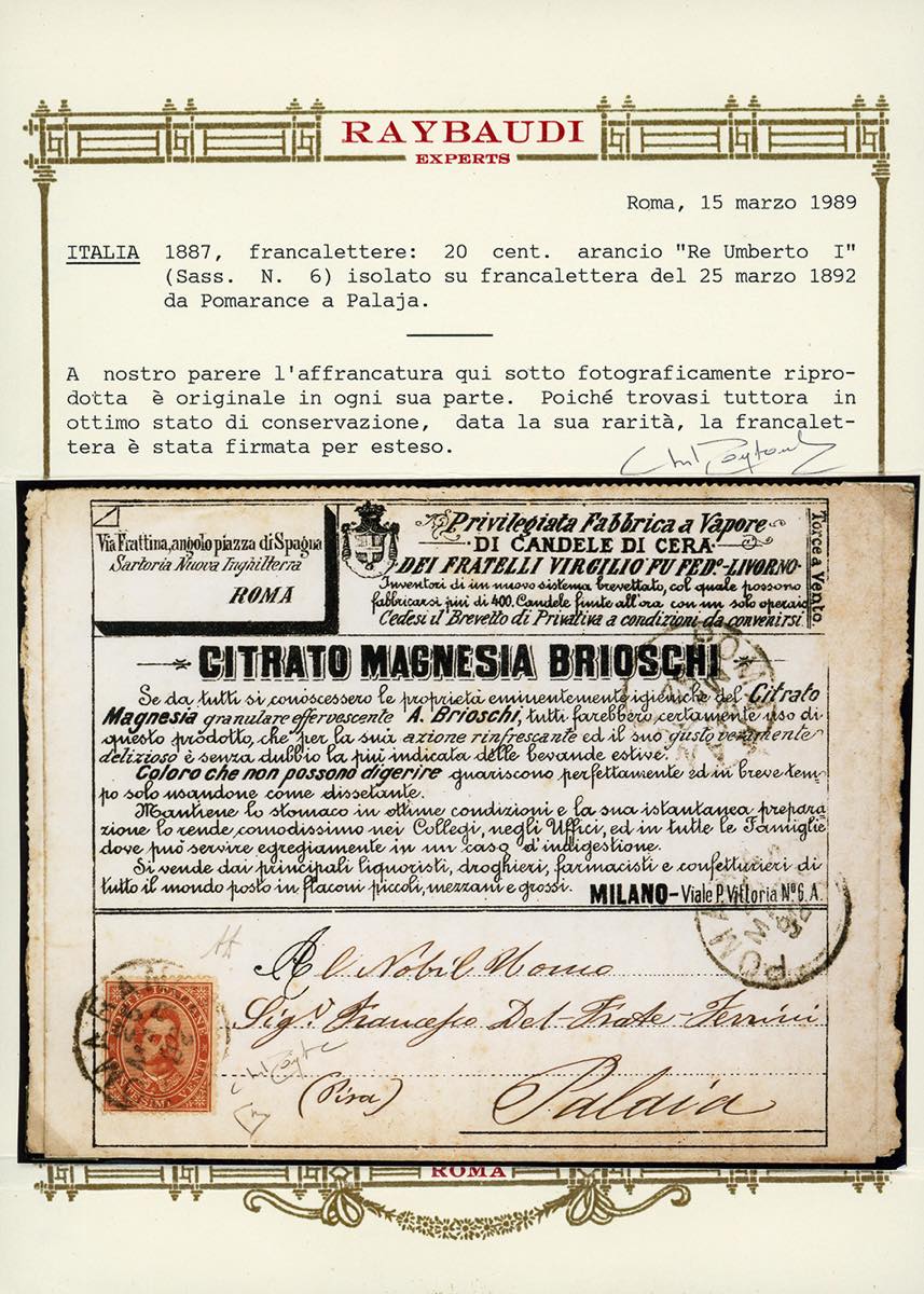 Lotto 1168 - FRANCALETTERE 1892 - 20 cent. Umberto I, perfetto, su busta ...