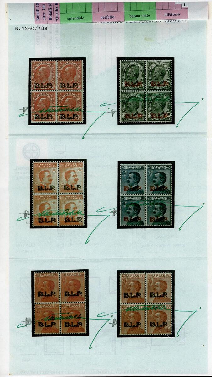 1923 - Soprastampati BLP, III tipo, serie completa (13/18), buona/ottima centratura, nuovi, gomma originale integra, perfetti. Ottima qualità, molto freschi. G.Bolaffi ed E.Diena, fotocopia cert. Finanziario Bolaffi 100% dei blocchi di quattro di provenienza.