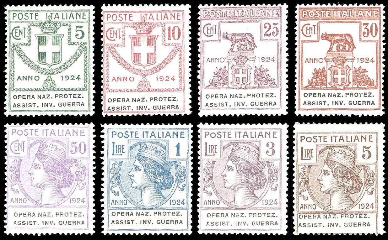 OPERA NAZ.PROTEZ.ASSIST.INV.GUERRA 1924 - Serie completa di otto valori (50/57), nuovi, gomma originale integra, perfetti. Molto freschi e ... Leggi tutto
