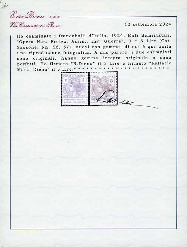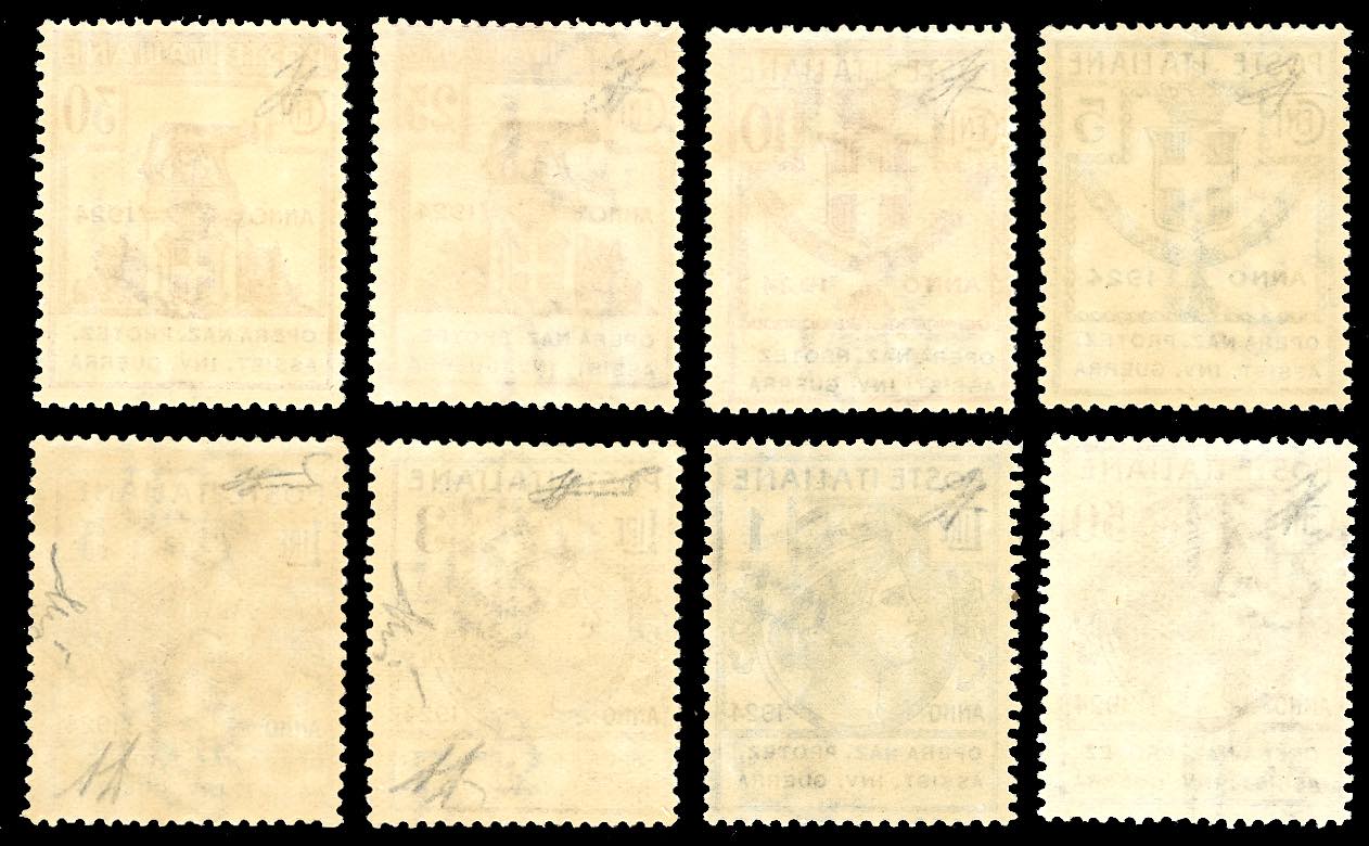 OPERA NAZ.PROTEZ.ASSIST.INV.GUERRA 1924 - Serie completa di otto valori (50/57), nuovi, gomma originale integra, perfetti. Molto freschi e rari. Firmati Ferrario, alti valori A.Diena, cert. Ferrario e Diena.