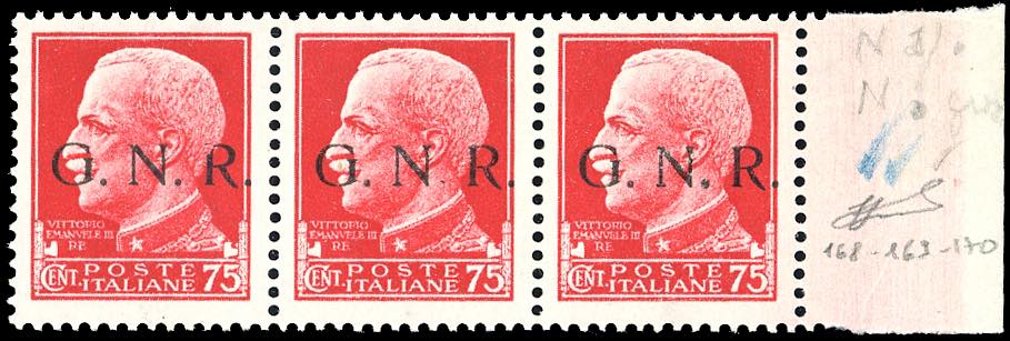 1943 - 75 cent. soprastampa G.N.R. di Brescia, I tipo, striscia orizzontale di tre, posizioni 168-170, il primo esemplare con la "R" scalpellata, il secondo con punto scalpellato dopo la "N", il terzo con punto grosso dopo la "N" (478/I var.non cat.,478/Ioa,478/Ipb), bordo di foglio, nuova, gomma originale integra, perfetta. Ferrario.