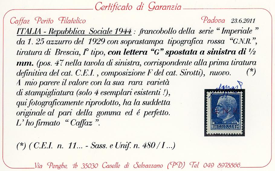 1943 - 1,25 lire soprastampa G.N.R. Del I tipo di Brescia, varietà "G" spostata a sinistra (480/I, non catalogato), nuovo, gomma originale, perfetto. Molto raro, pochissimi esistenti. Dettagliato cert. Caffaz.