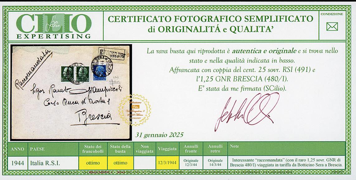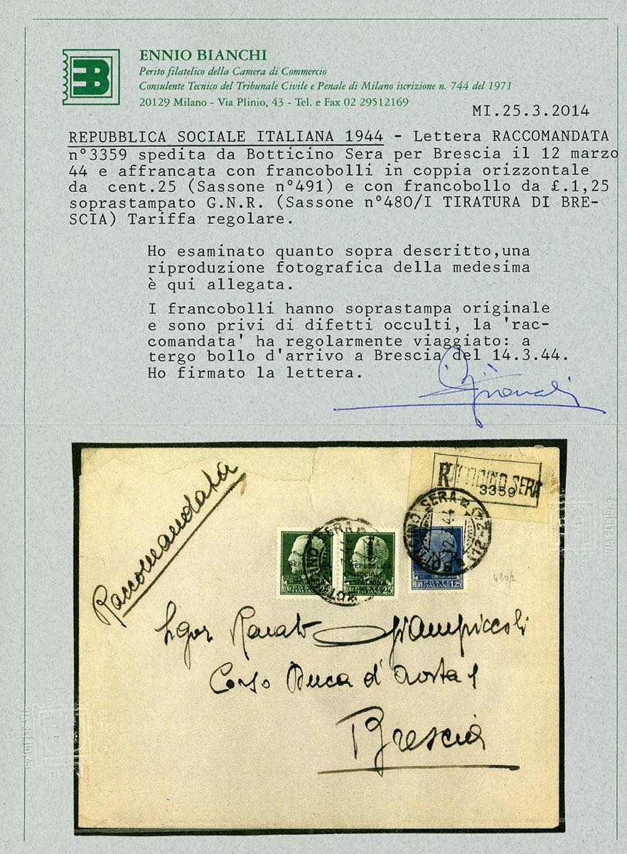 1944 - 1,25 lire, soprastampa G.N.R. di Brescia, I tipo, 25 cent. soprastampato fascetto, coppia (480/I,491), perfetti, in perfetta tariffa, su busta raccomandata da Botticino Sera 12/3/1944 a Brescia, bollo d'arrivo al verso. Molto rara. Cert. Bianchi e Cilio.