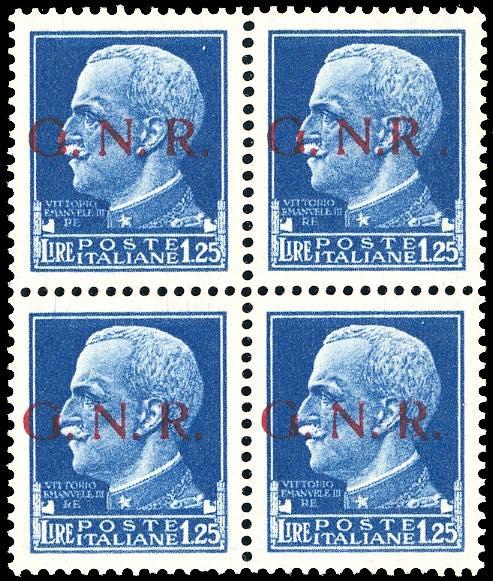 1943 - 1,25 lire, soprastampa G.N.R. di Brescia, I tipo, blocco di quattro, un esemplare con varietà "R" accostata a "N" (480/Il,480/I), nuovo senza gomma, perfetto. Tiratura 5 esemplari della varietà, insieme PROBABILMENTE UNICO. Fiecchi, Sirotti, Ferrario, cert. Oro Raybaudi (cat.Sassone € 76.500 per gomma integra).