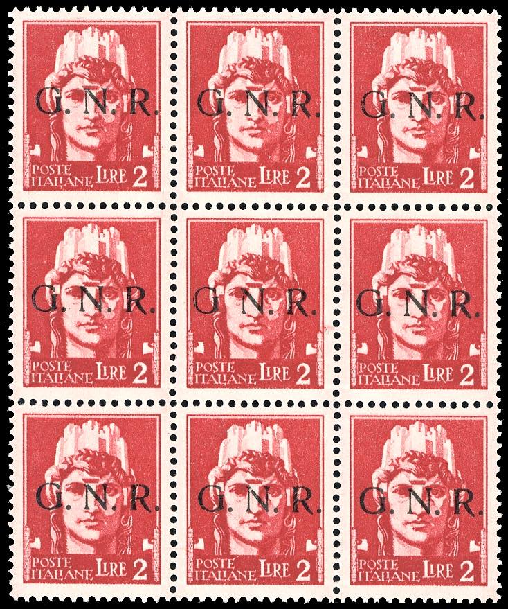 1943 - 2 lire, soprastampa G.N.R. di Brescia, I tipo, blocco di nove esemplari con al centro la varietà senza punto dopo la "G" ... Leggi tutto