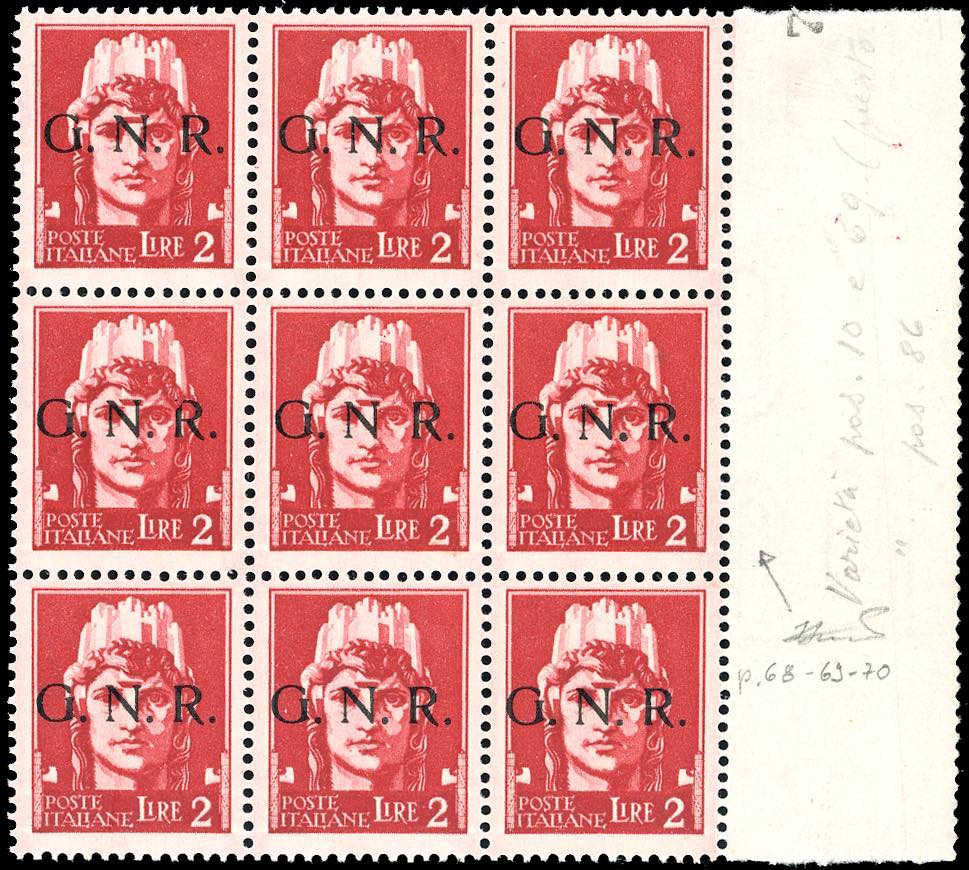 1943 - 2 lire, soprastampa G.N.R. di >Brescia, I tipo, blocco di nove con al centro la striscia orizzontale di tre posiz. 168-170, il primo esemplare con la "R" scalpellata, il secondo senza punto dopo la "N", il terzo con punto grosso dopo la "N" (478/I var.non cat.,482/Io,482/Ipb), bordo di foglio, nuovo, gomma originale integra, perfetto. Cert. Ferrario.