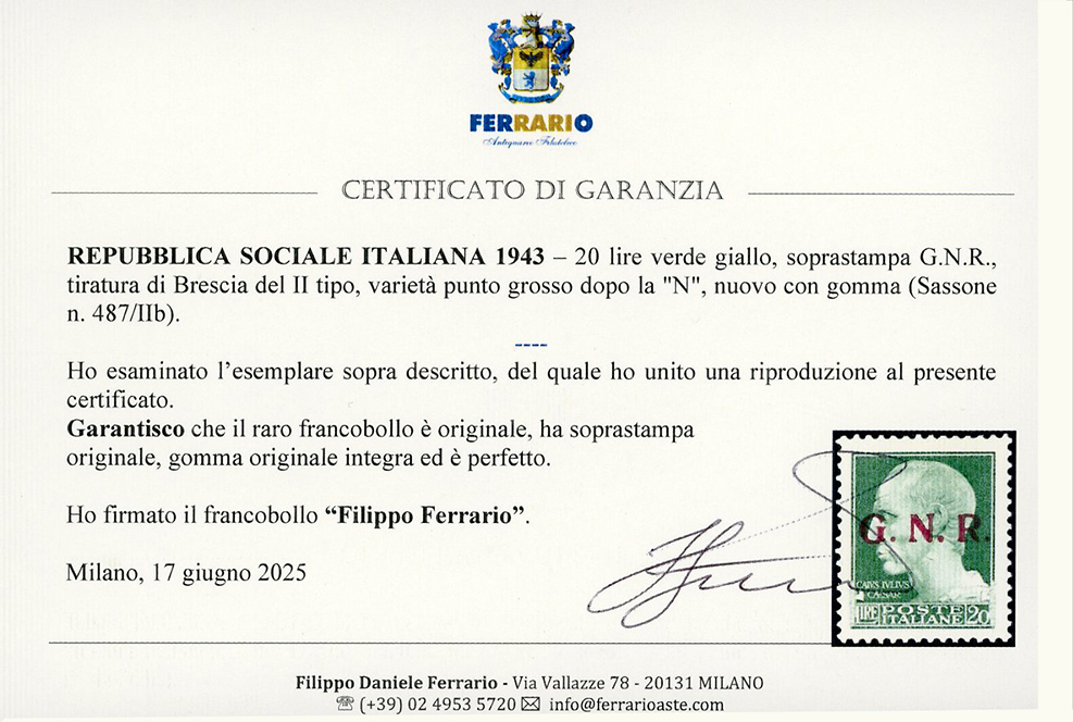1943 - 20 lire, soprastampa G.N.R. di Brescia, II tipo, varietà punto grosso dopo la "N" (487/IIb), nuovo, gomma originale integra, perfetto. Molto raro. Raybaudi, Fiecchi, cert. Ferrario.