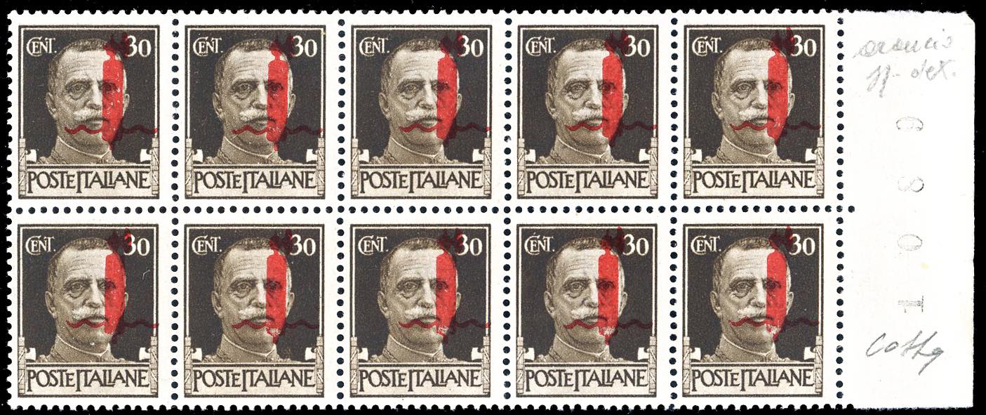 1944 - 10 cent. soprastampa fascio in rosso arancio (492E), blocco di 10 esemplari con soprastampa fortemente spostata a destra, quattro esemplari con fascio incompleto, bordo di foglio, nuovo, gomma originale integra, perfetto. Colla.