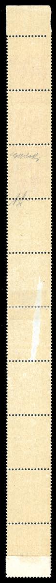1944 - 75 cent. Tamburino, senza filigrana, striscia verticale di 10 esemplari con dentellatura orizzontale fortemente spostata, il primo valore senza il tassello con le diciture e sette esemplari senza la stampa (508), nuova, gomma originale integra, perfetta. Molto bella e rara, non catalogata. G.Bolaffi, cert. A.Diena.