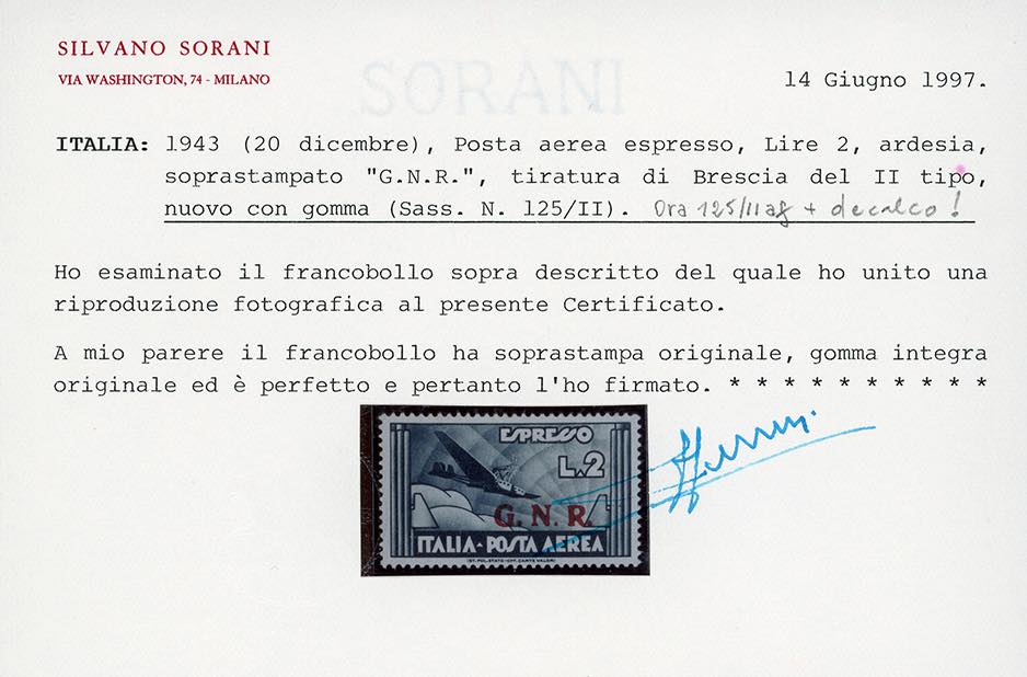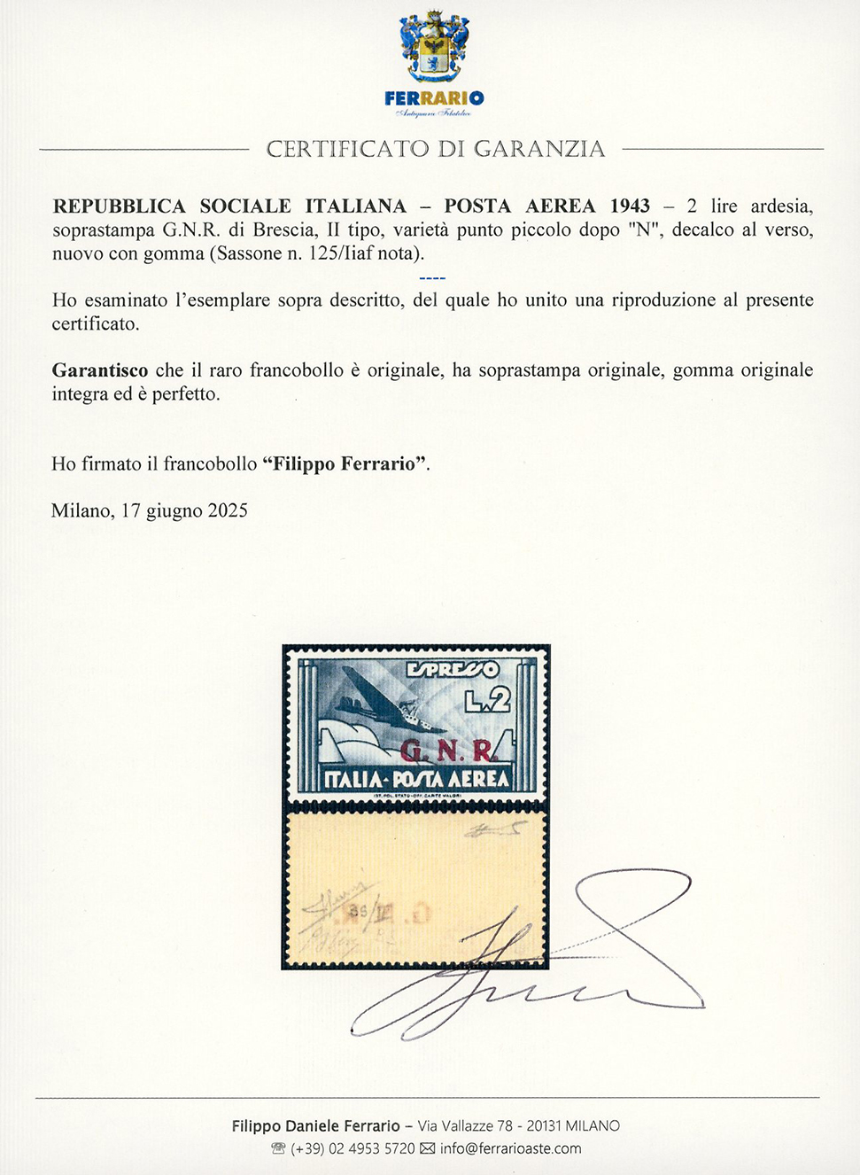 1943 - 2 lire, soprastampa G.N.R. di Brescia, II tipo, varietà punto piccolo dopo "N", decalco al verso (125/Iiaf nota), nuovo, gomma originale integra, perfetto. Molto raro. G.Oliva, cert. Sorani e Ferrario.