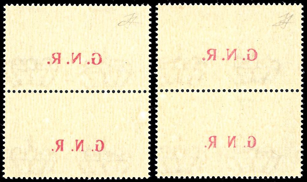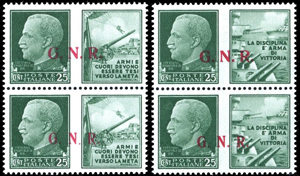 1943 - 25 cent. Marina ed Esercito, soprastampa G.N.R. di Brescia, coppie verticali con soprastampa del II e del III tipo, decalco al verso ... Leggi tutto