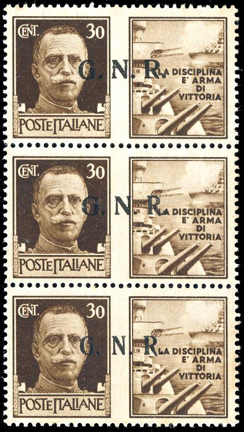 1943 - 30 cent. Marina, soprastampa G.N.R. di Brescia, trittico (17/II-IIa-III), nuovo, gomma originale integra, perfetto, lieve inbrunimento al verso. Cert. Colla.
