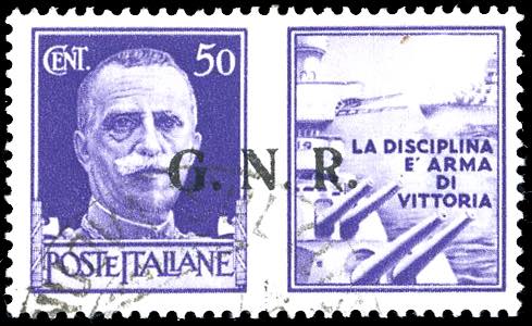 1943 - 50 cent. Marina, soprastampa G.N.R. di Brescia, "G.N." del II tipo, "R" del III (23/Iia), usato, perfetto. Molto raro allo stato di usato. Ferrario, cert. Sirotti.
