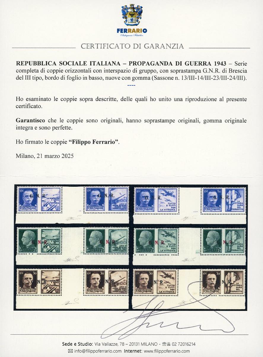 1943 - Soprastampati G.N.R. di Brescia, III tipo, coppie orizzontali con interspazio di gruppo, serie completa ... Leggi tutto