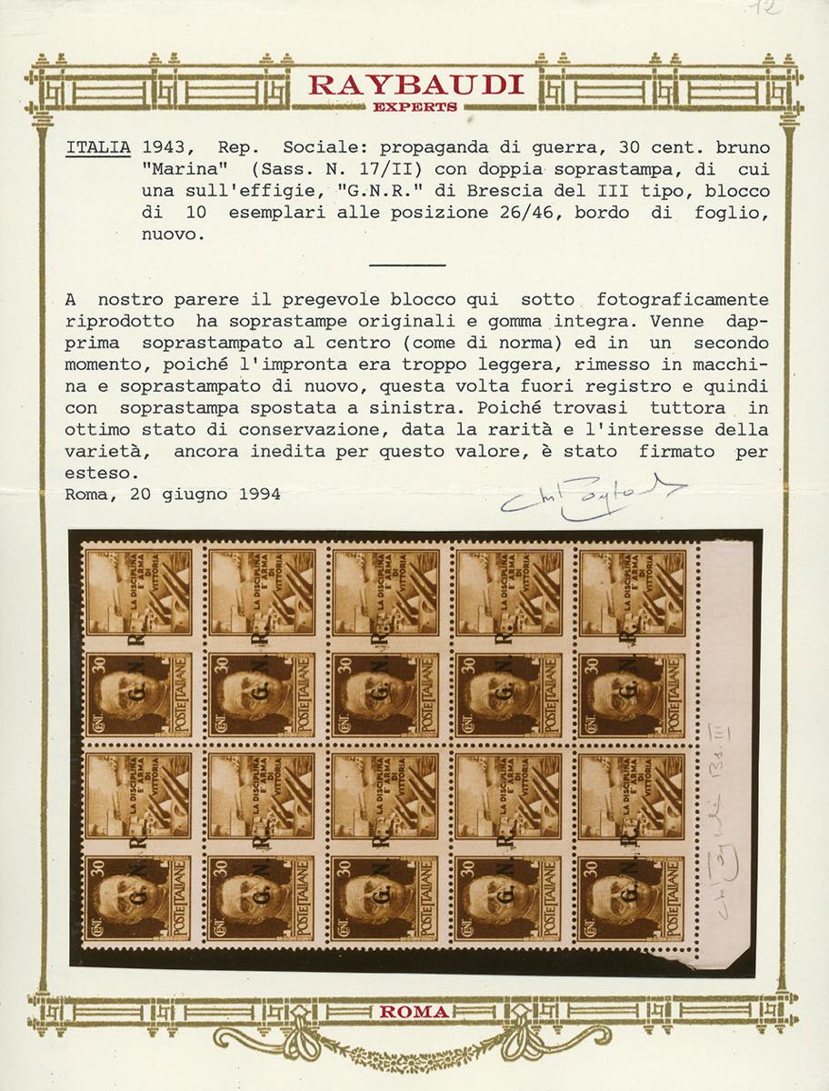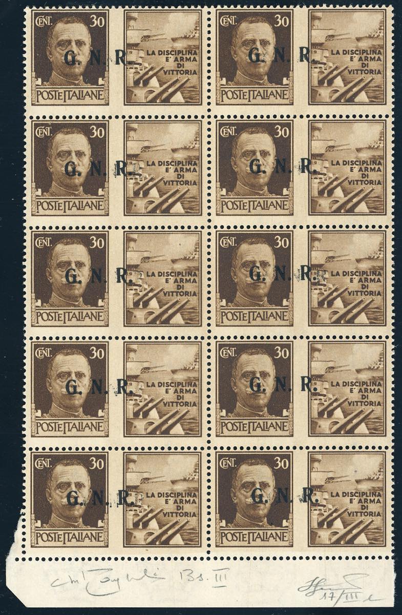 1943 - 30 cent. Marina, blocco di dieci esemplari, posiz. 26/46 del foglio, doppia soprastampa G.N.R. III tipo di Brescia, una debolmente impressa al centro, l'altra spostata sull'effigie (17/IIIc), nuovo, gomma originale integra, perfetto. Insieme di ottima qualità e raro. Ferrario, cert. Oro Raybaudi.