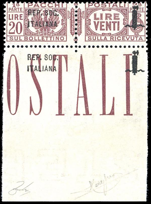 1944 - 20 lire, soprastampa ripetuta anche sul bordo inferiore di foglio (47dc), nuovo, gomma originale integra, perfetto. Raro. Raybaudi, cert. Ferrario.