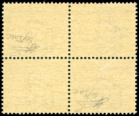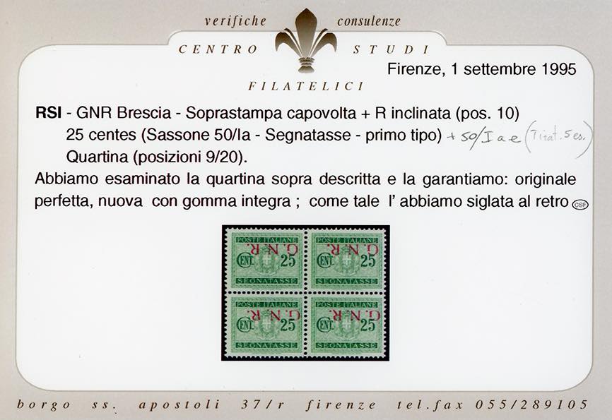 1943 - 25 cent., soprastampa G.N.R. di Brescia del I tipo capovolta, blocco di quattro esemplari, un esemplare con varietà "R" inclinata, uno con punto grosso dopo la "R" (50/Iae,50/Iaec,50/Ia), nuovo, gomma originale integra, l'esemplare con "R" inclinata con leggera traccia di linguella, perfetto. Estremamente raro, tiratura 5 esemplari della varietà. Ferrario, cert. commerciale.