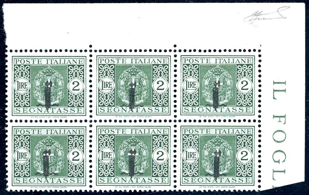 1944 - 2 lire verde, soprastampa fortemente spostata in basso (69d), blocco di sei, angolo di foglio, nuovo, gomma originale integra, ... Leggi tutto