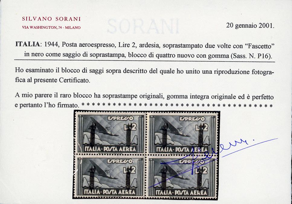 POSTA AEREA 1944 - 2 lire ardesia, soprastampa fascio in nero ripetuta due volte (P16), blocco di quattro, gomma originale integra, perfetto. Raro. Cert. Sorani.