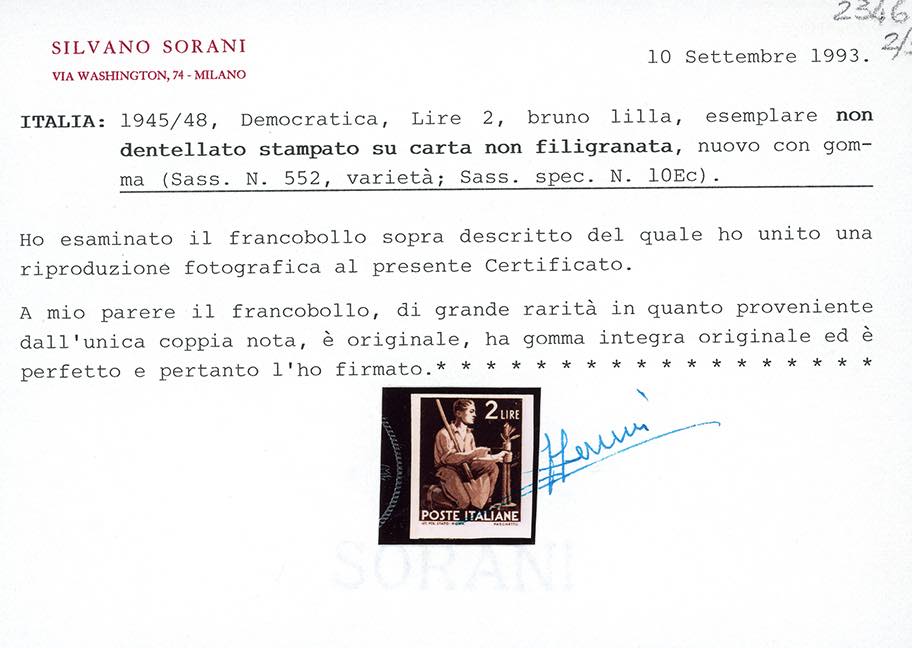 1945 - 2 lire Democratica, senza filigrana e non dentellato (552d), gomma originale integra, perfetto. Estremamente raro, DUE SOLI ESMEPLARI NOTI. Cert. Carraro, Sorani e fotocopia del cert. Raybaudi della coppia di provenienza.