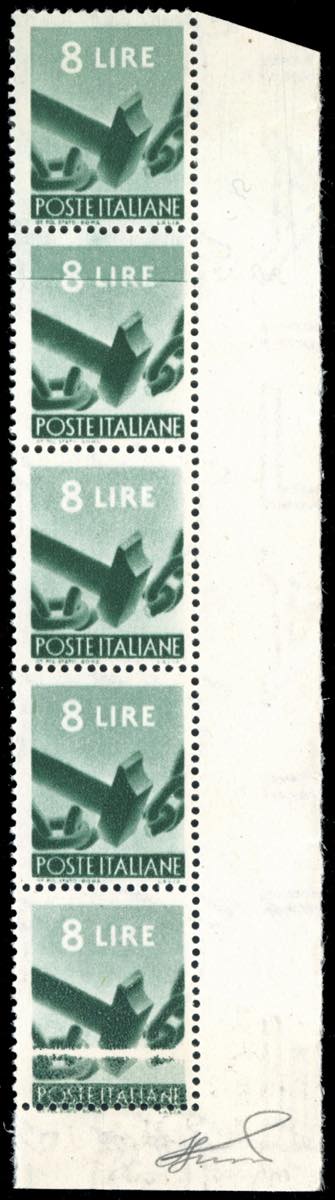 1945 - 8 lire Democratica (557), striscia verticale di cinque, una riga orizzontale di colore sul secondo esemplare, una bianca sul quinto, ... Leggi tutto