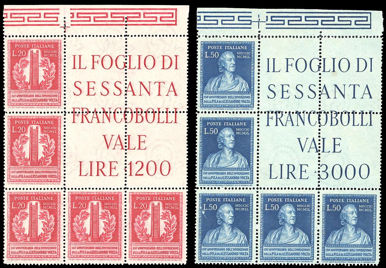 1949 - Volta, serie completa (611/612), blocchi angolari di cinque, bordo di foglio in alto, nuovi, gomma originale integra, perfetti e molto freschi. Ferrario.