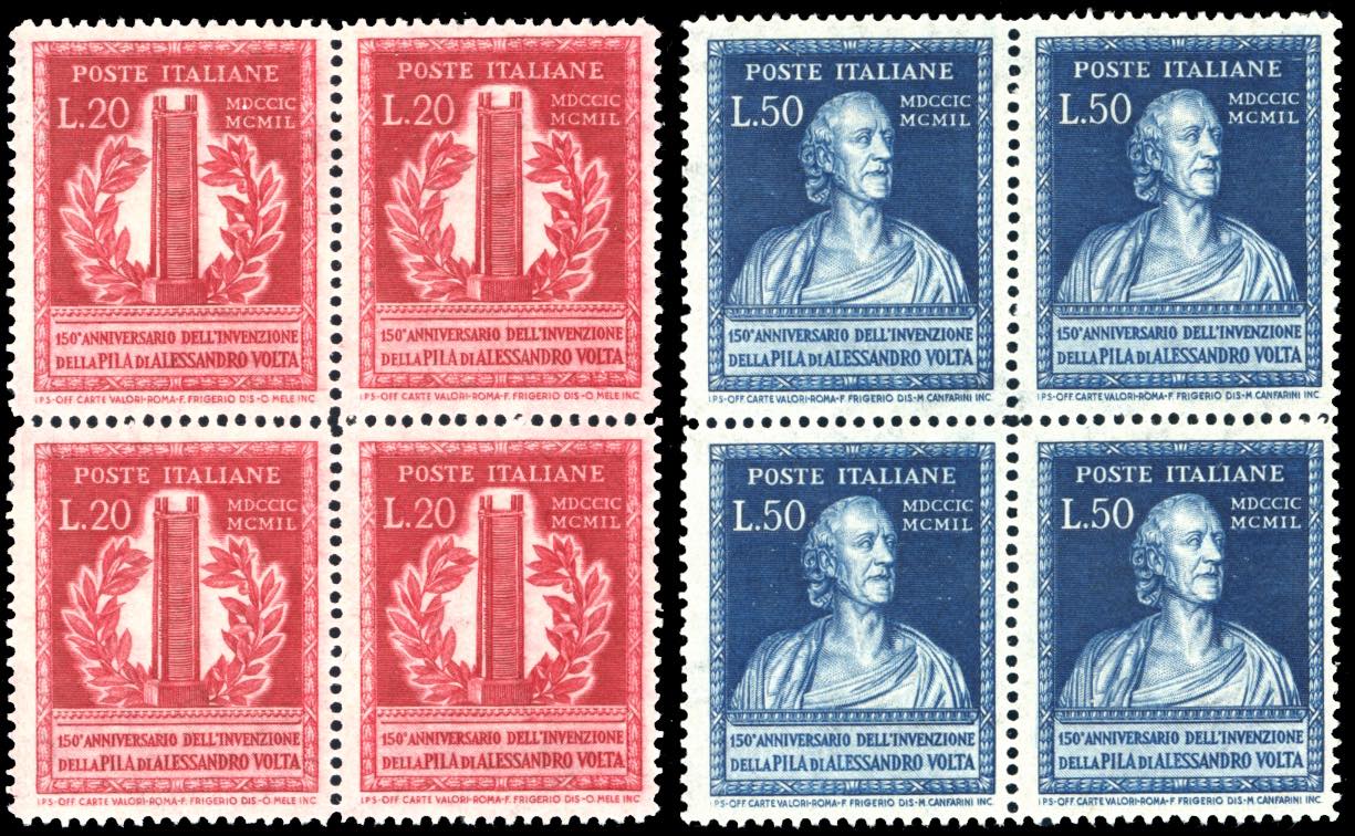 1949 - Volta, serie completa (611/612), ottima centratura, blocchi di quattro, gomma originale integra, perfetti. Ferrario.