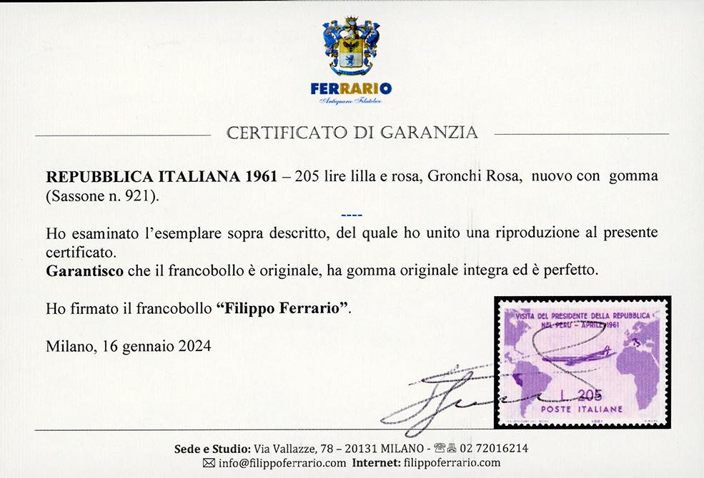 1961 - 205 lire Gronchi rosa (921), gomma originale integra, perfetto. Cert. Ferrario.