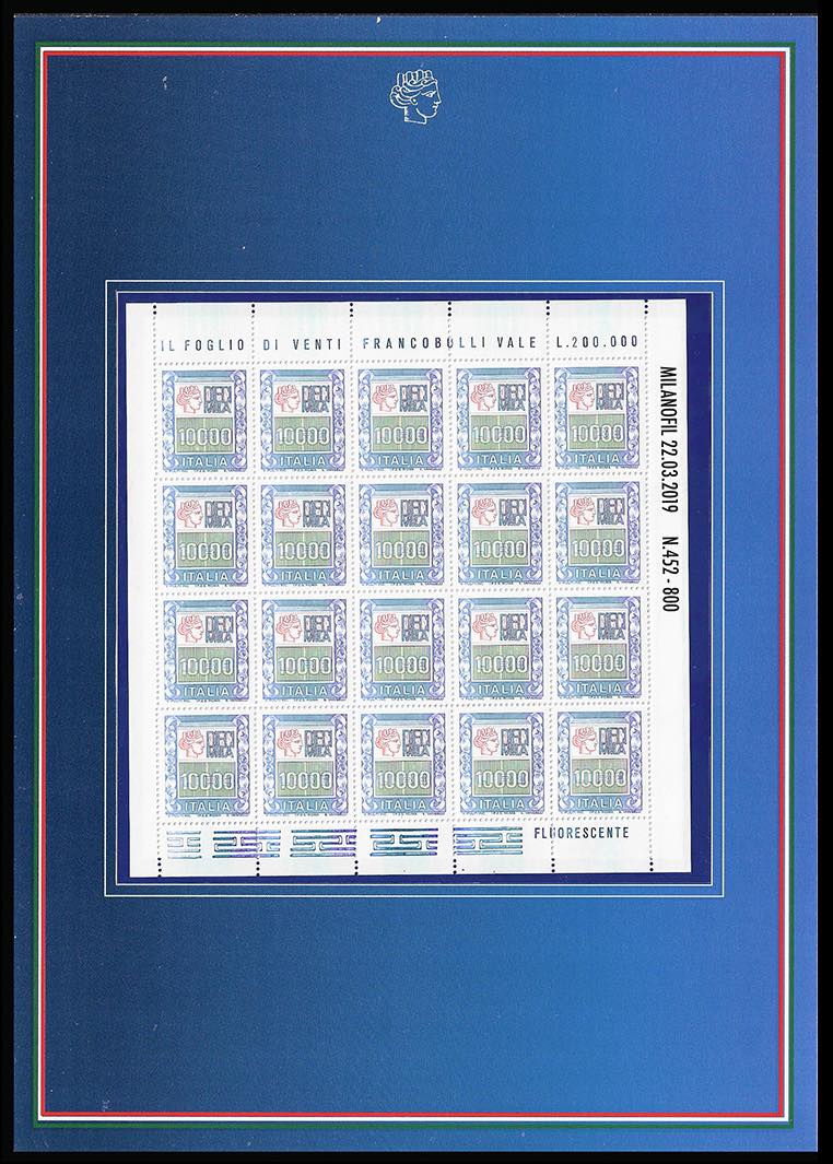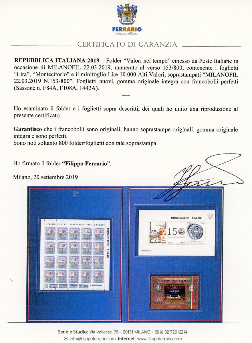 2019 - Folder "Valori nel tempo", comprendente i tre foglietti soprastampati "Milanophil 22.03.2019" numerati (84A, 108A, nota minifoglio n. 1442A), nuovi, perfetti. Molto raro, tiratura 800 esemplari. Cert. Ferrario.