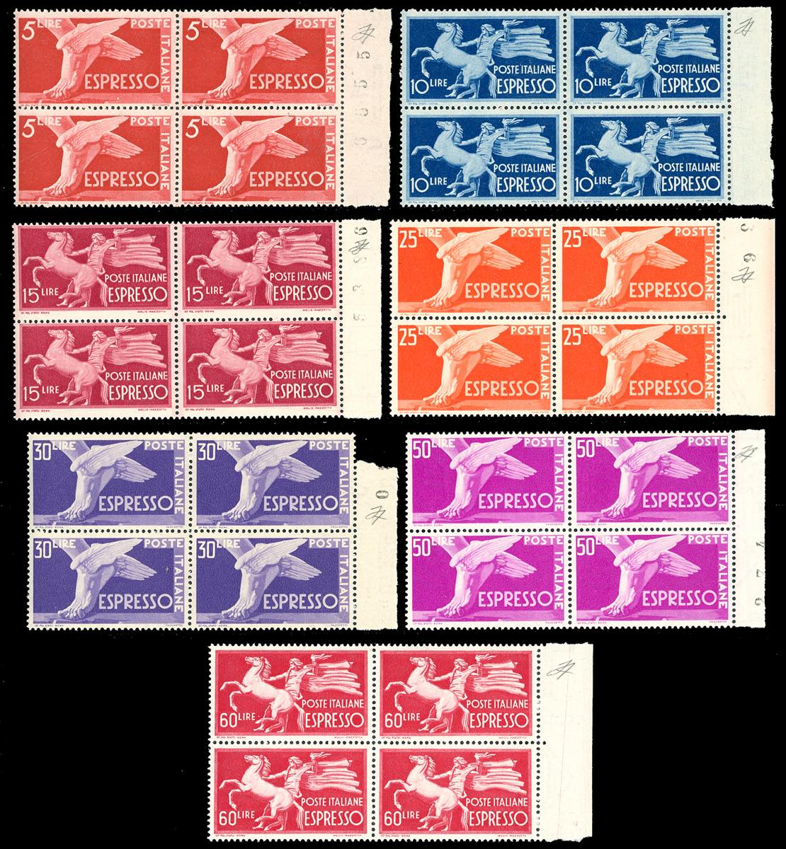 1945/52 - Democratica, serie completa (25/31), blocchi di quattro, bordo di foglio, nuovi, gomma originale integra, perfetti. Molto freschi. Ferrario.