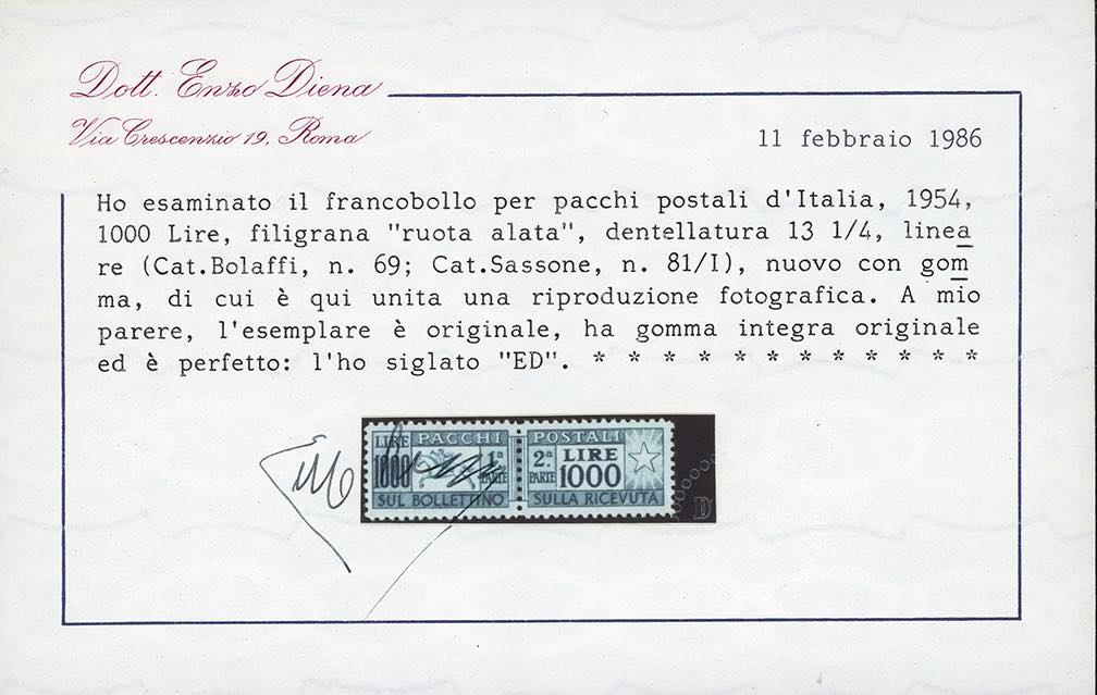 1954 - 1.000 lire Cavallino, filigrana ruota, dentellatura lineare (81/I), buona centratura, gomma originale integra, perfetto. Cert. E.Diena.