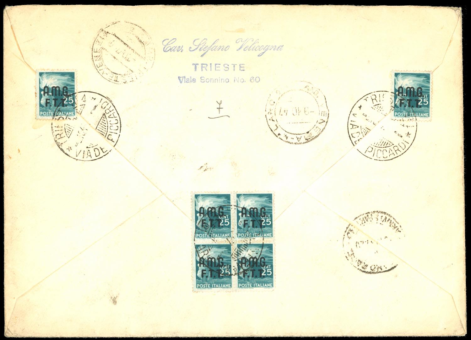 1947 - Assicurata per lire 4.000 con affrancatura coreografica della serie Democratica, soprastampa su due righe, posta ordinaria, aerea ed espressi (1/8,12/17,A1/A6,E1,E3), da Trieste 3/10/1947 a Bergamo. Ferrario.