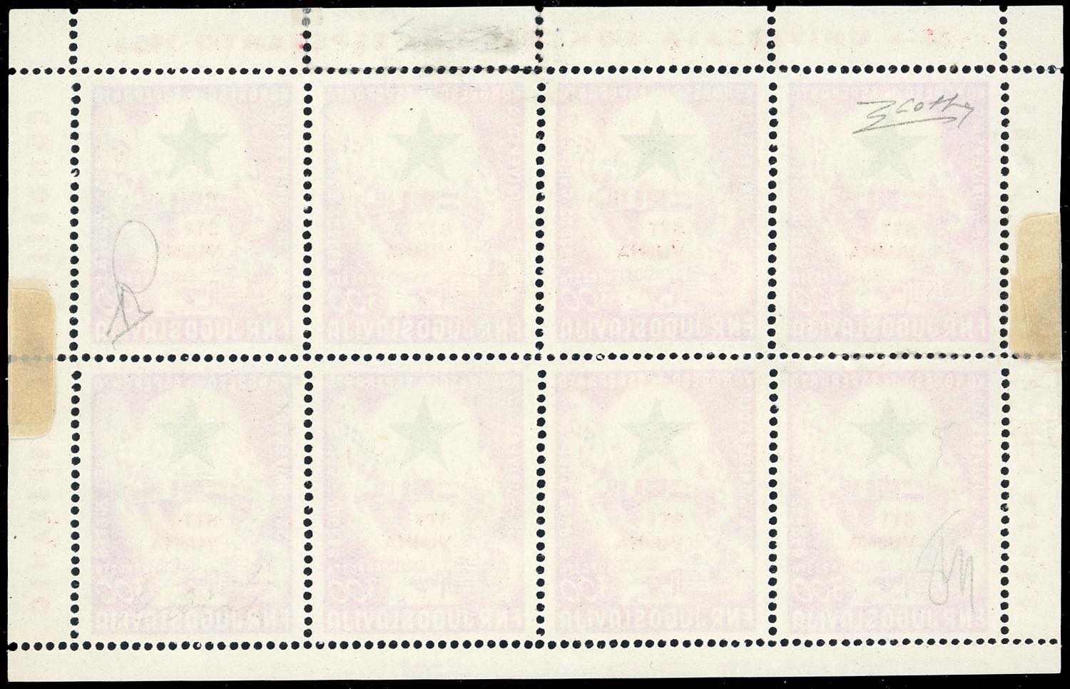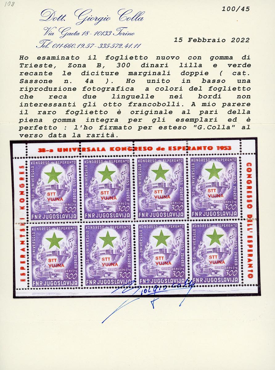 FOGLIETTI 1953 - 300 d. Congresso Esperanto, foglietto, diciture marginali doppie (4a), nuovo, gomma orignale, integra per i francobolli, due linguelle sui bordi, perfetto. Molto raro! Cert. Colla (cat.Sassone € 60.000 come gomma integra).