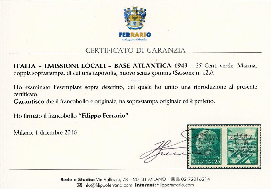 BASE ATLANTICA 1943 - 25 cent. propaganda di guerra, Marina, doppia soprastampa di cui una capovolta (12a), senza gomma, perfetto. G.Oliva, Colla. Cert. Ferrario.