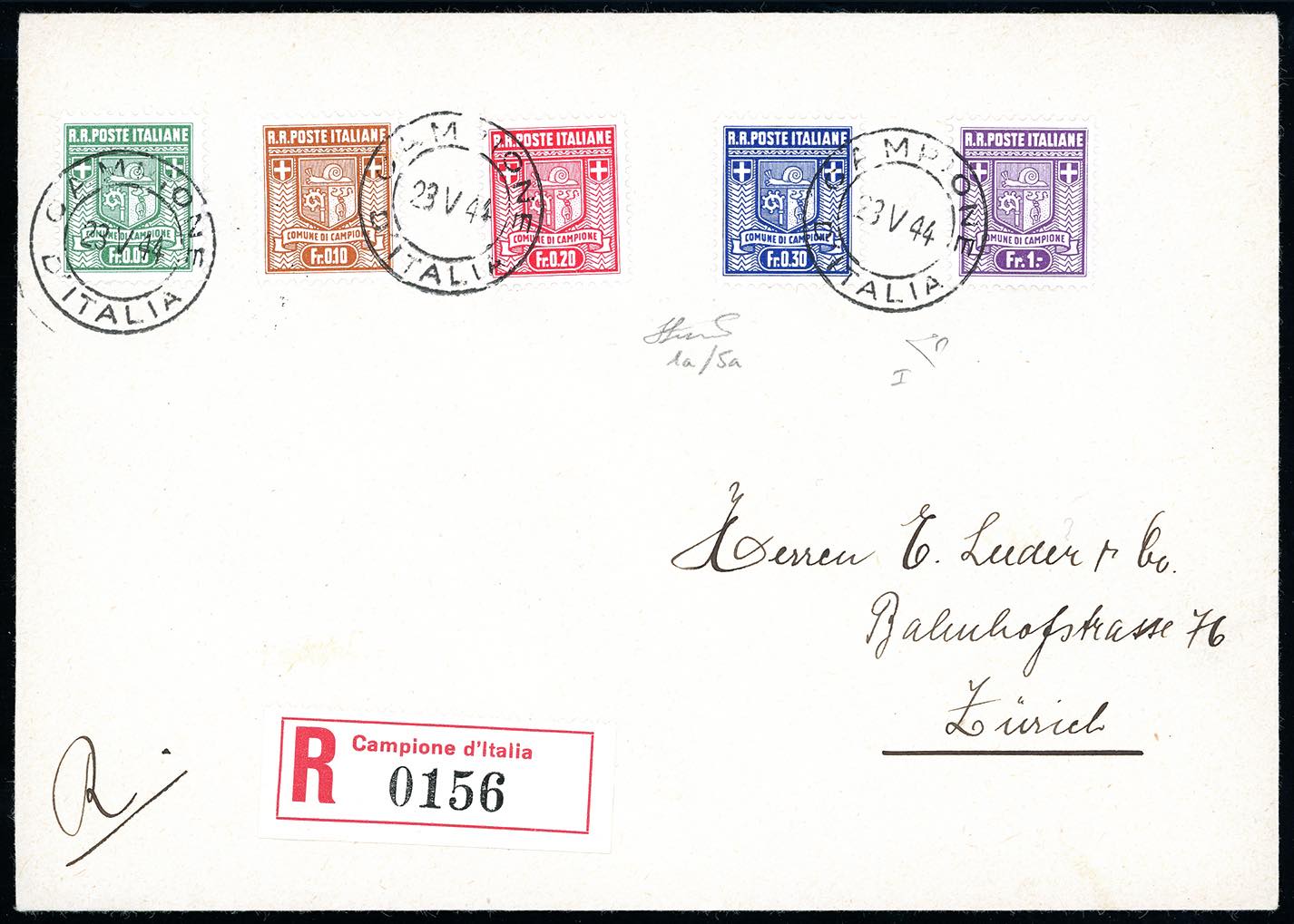 CAMPIONE D'ITALIA 1944 - Stemma, serie completa della I tiratura, dent. 11 1/2 (1a/5a), perfetti, su busta raccomandata da Campione 23/5/1944 a Zurigo, bollo d'arrivo. Bella. Cert. Ferrario.
