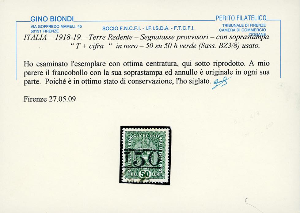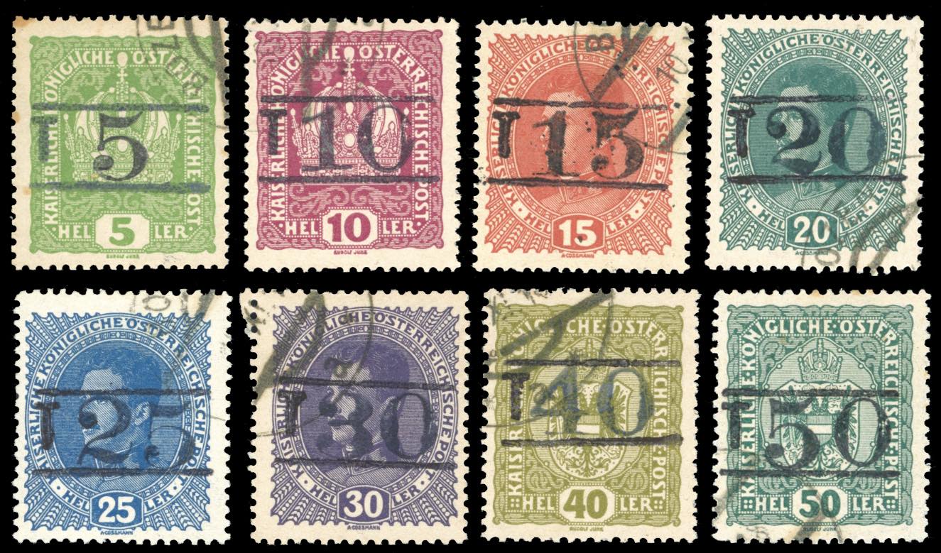 TRENTINO ALTO ADIGE-SEGNATASSE BOLZANO 1918/19 - Soprastampati "T" e cifra fra due righe in orizzontale, serietta di 8 valori (BZ3/1-BZ3/8), usati, perfetti, Raybaudi per l'alto valore.