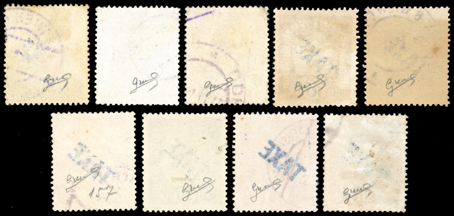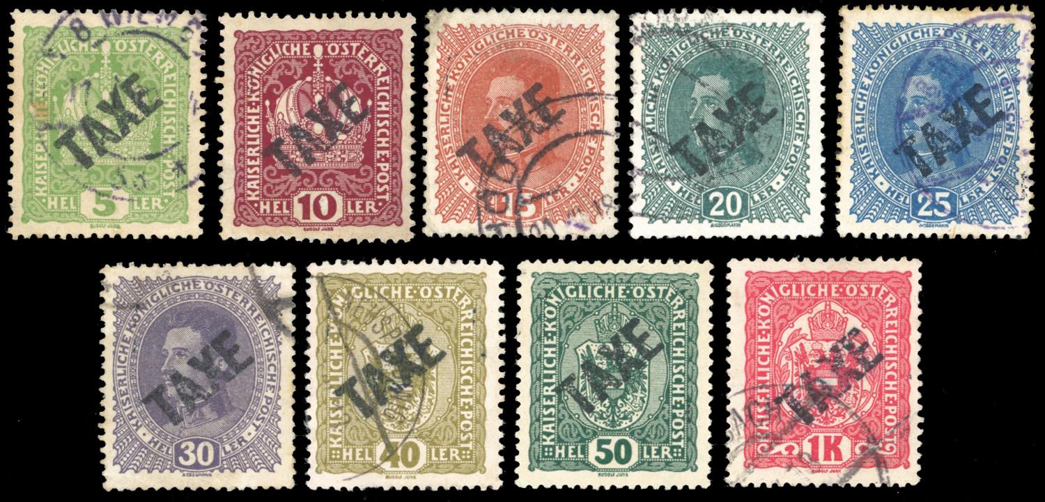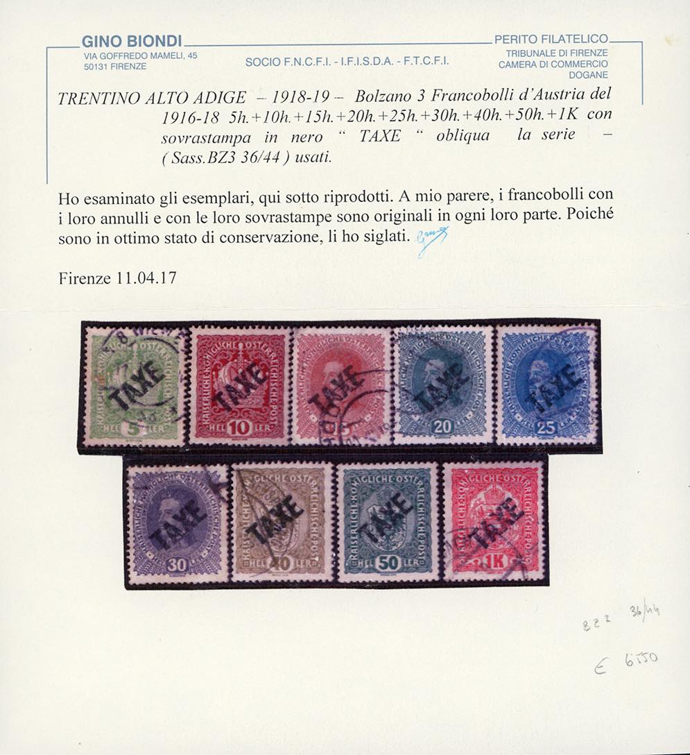 TRENTINO ALTO ADIGE-SEGNATASSE BOLZANO 1918/19 - Francobolli d'Austria soprastampati "taxe" in obliquo, serie completa (BZ3/36-BZ3/44), usati, ad eccezione del 10 h. e del 50 h. nuovi senza gomma.
