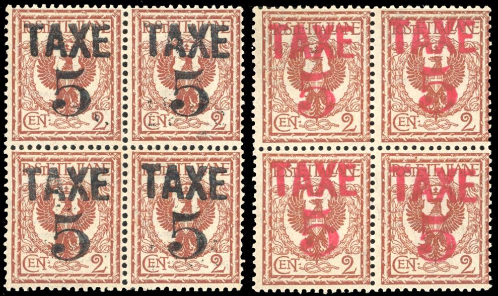TRENTINO ALTO ADIGE-SEGNATASSE BOLZANO 1919 - 5 su 2 cent. Floreale, soprastampa nera e rossa (BZ3/75,76), blocchi di quattro, nuovi, gomma integra, perfetti.