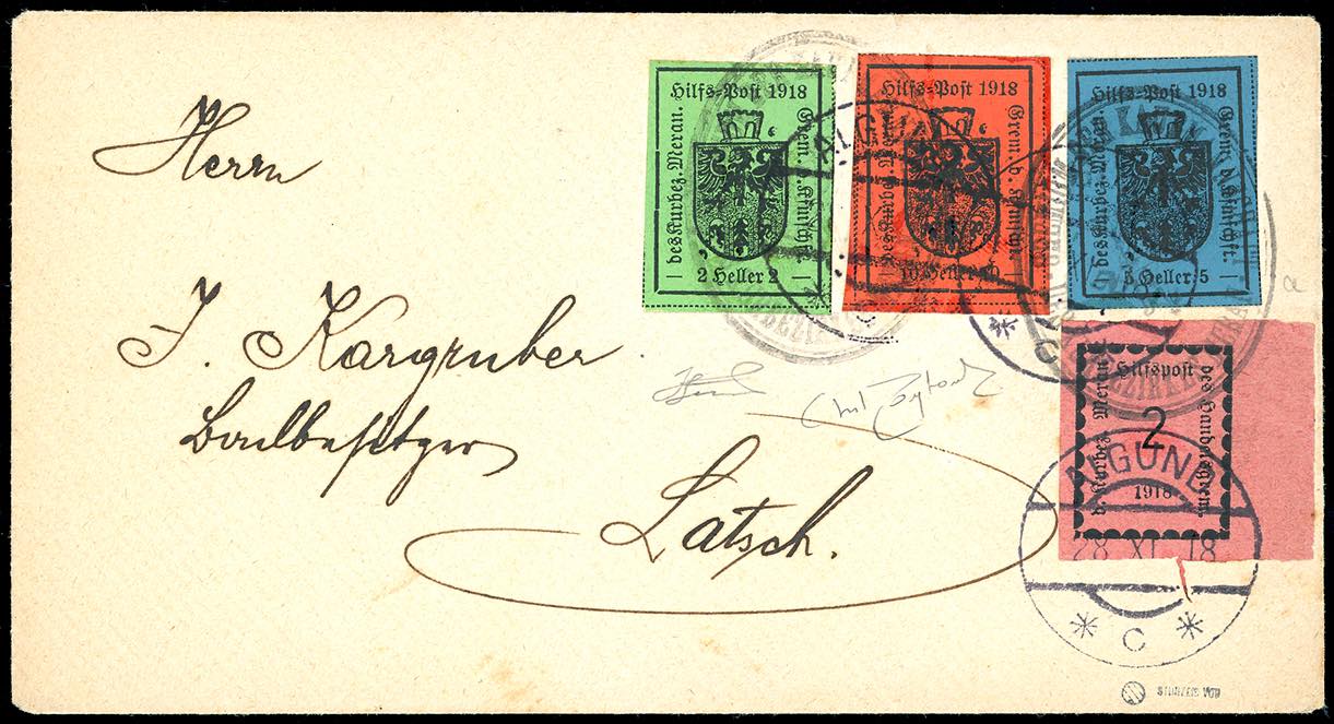 MERANO 1918 - 10 h. rosso mattone, II tipo, errore "KFMSCHT" (8B), insieme a 2 h. rosa, prima emissione, 2 h. e 5 h. II tipo (1,6,7), tutti perfetti, su busta da Lagund 28/11/1918 a Latsch. Raro insieme. Ferrario, cert. Raybaudi.
