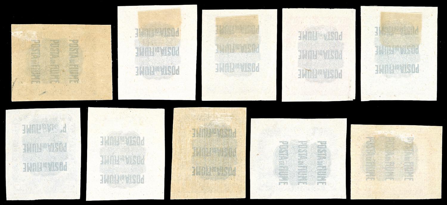 FIUME 1919 - 5 cent., 10 cent., 15 cent., 20 cent., 45 cent., 60 cent., 80 cent. violetto, 3 cor., 5 cor. e 10 cor. Plebiscito, non dentellati (62b,63b,64b,65b,66b,67b,68ab,71b,72b,73b), nuovi senza gomma, i valori da 45 cent., 60 cent. e 3 cor. con gomma originale, perfetti. Il 5 cent. e l'80 cent. violetto sono inediti e non catalogati con questa varietà. Insieme molto raro, di ottima qualità.