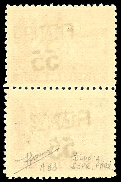 FIUME 1919/20 - 55 cent. su 1 cor. soprastampato "FRANCO", carta A (A83), coppia verticale, l'esemplare inferiore con parziale doppia soprastampa, gomma originale integra, perfetta. Varietà rara e d'effetto, ad oggi non catalogata per questo valore. UNICO ESEMPLARE NOTO. Cert. Sorani (cat.Sassone € 8.000 per la coppia senza varietà).