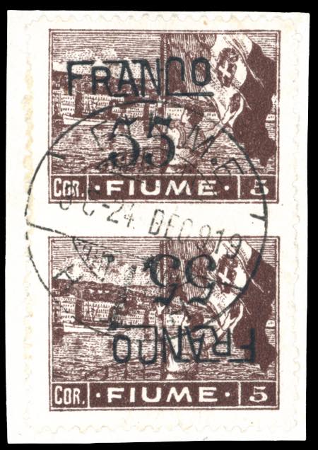 FIUME 1919/20 - 55 cent. su 5 cor., carta C, coppia verticale non dentellata al centro e con l'esemplare inferiore con soprastampa capovolta (C86na), perfetta, usata su frammento. Raybaudi, Ferrario.