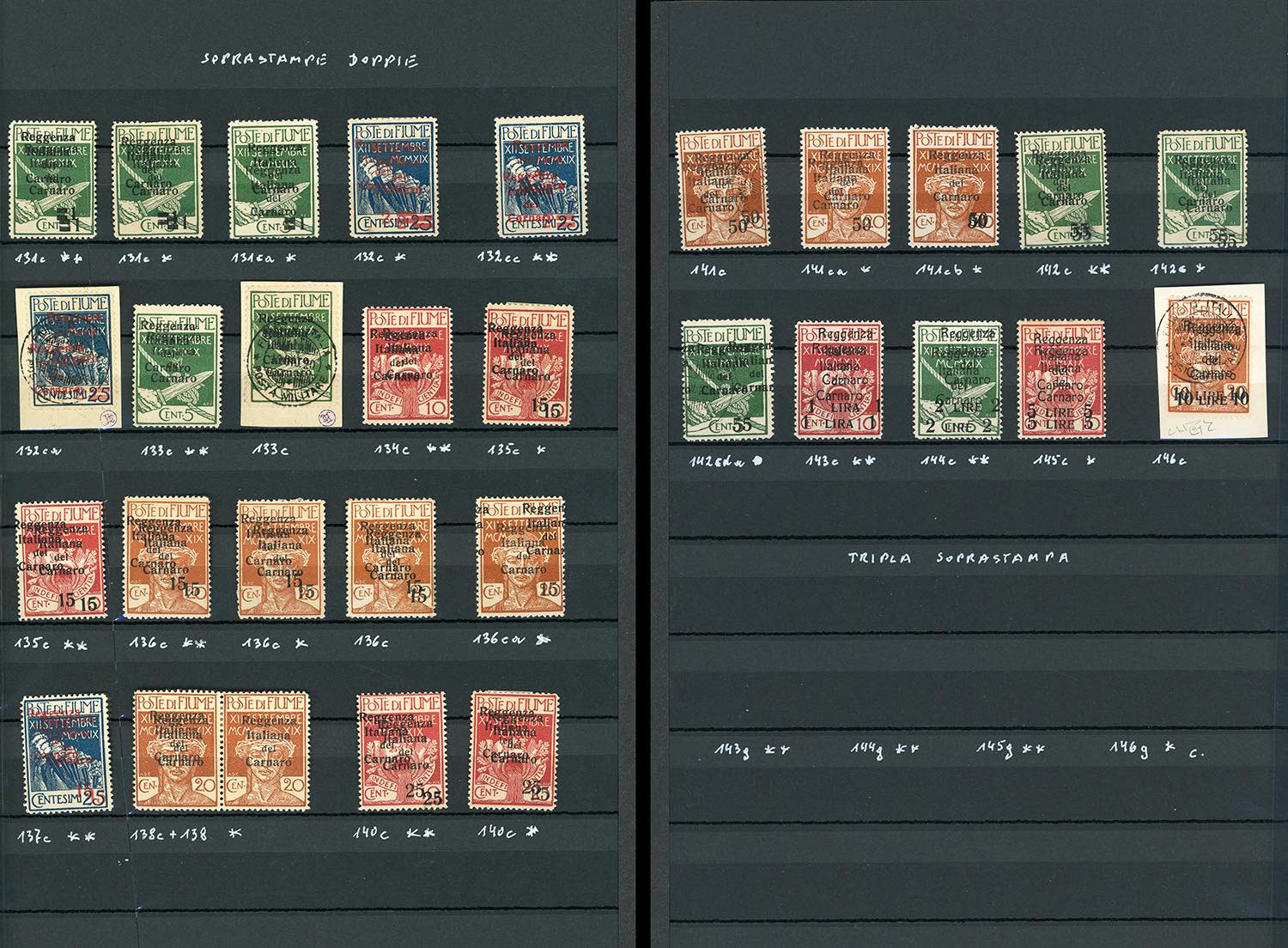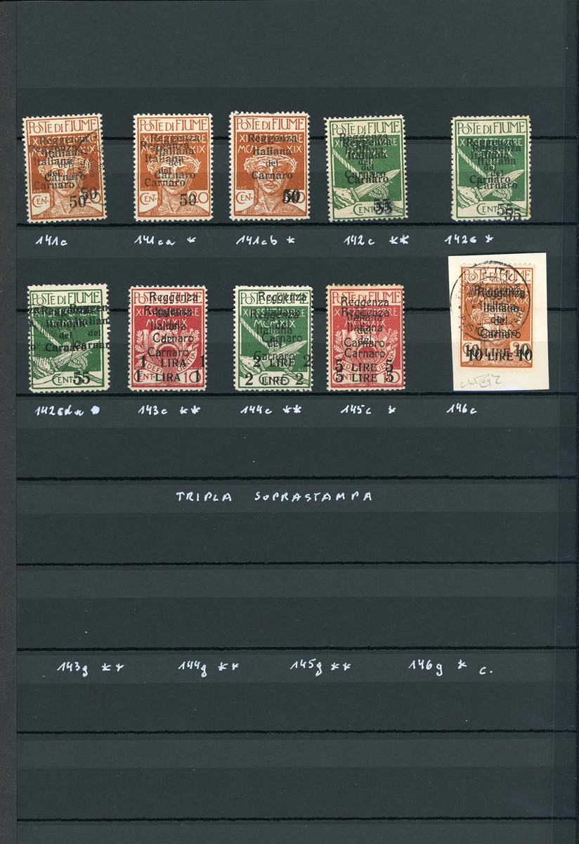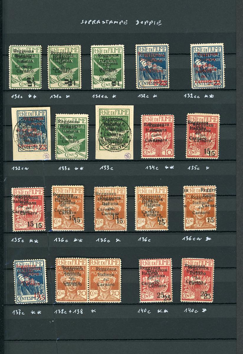 FIUME 1920 - Soprastampati "Reggenza Italiana del Carnaro", 29 esemplari, anche ripetuti, tutti con doppia soprastampa (131c/146c), nuovi o usati, perfetti ad eccezione di due esemplari. Diversi esemplari firmati da noti periti.