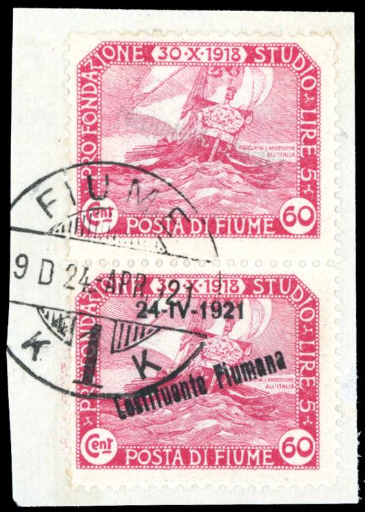 FIUME 1921 - 60 cent. soprastampato "Costituente Fiumana", coppia verticale, il primo esemplare senza soprastampa (169b), perfetta, usata su frammento. Rara. Ferrario.