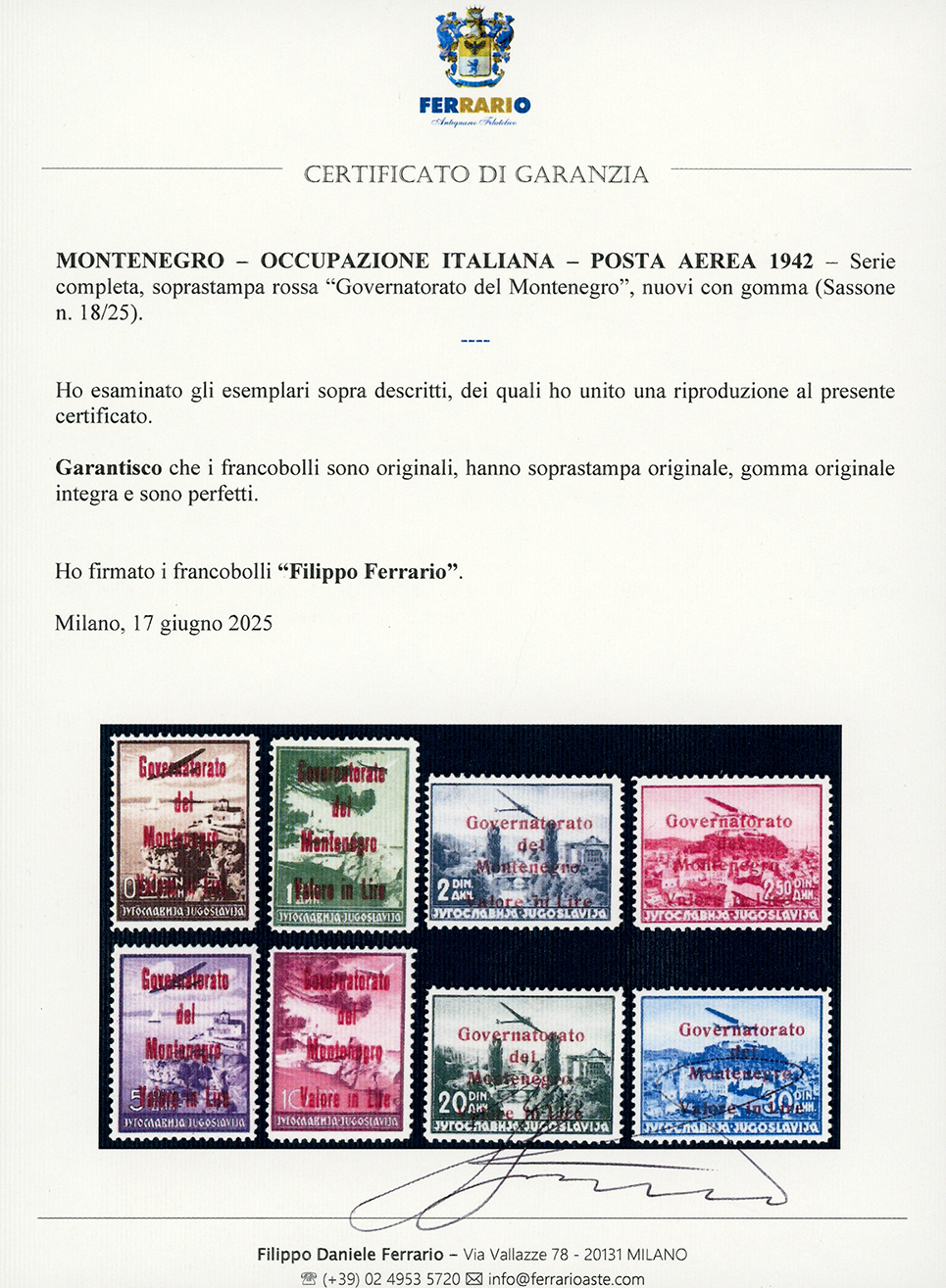 MONTENEGRO POSTA AEREA 1942 - Soprastampati in rosso, serie completa (18/25), nuovi, gomma originale integra, perfetti. A.Diena, Raybaudi, cert. Ferrario.