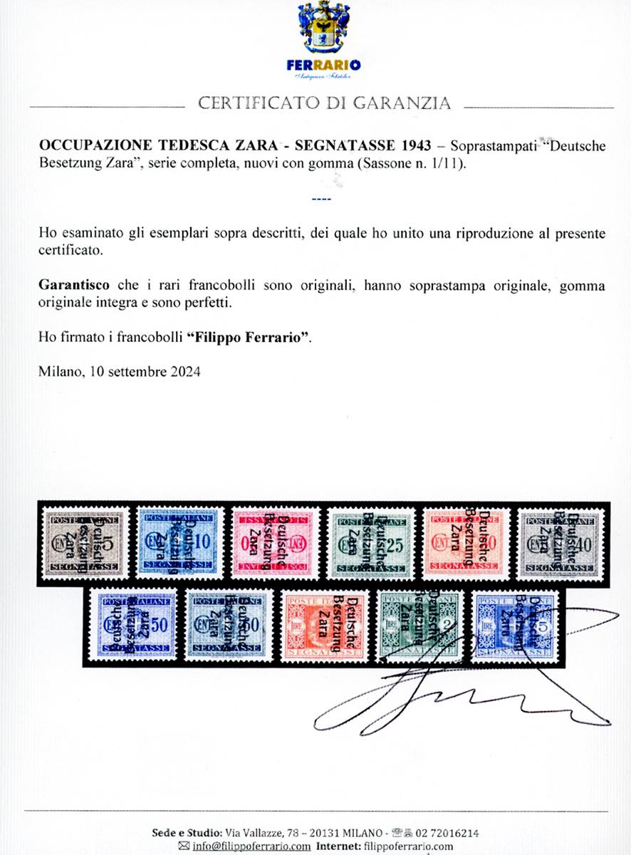 OCCUPAZIONE TEDESCA ZARA SEGNATASSE 1943 - Soprastampati, serie completa (1/11), gomma originale integra, perfetti. Rari e di ottima qualità. Sassone, cert. Ferrario.