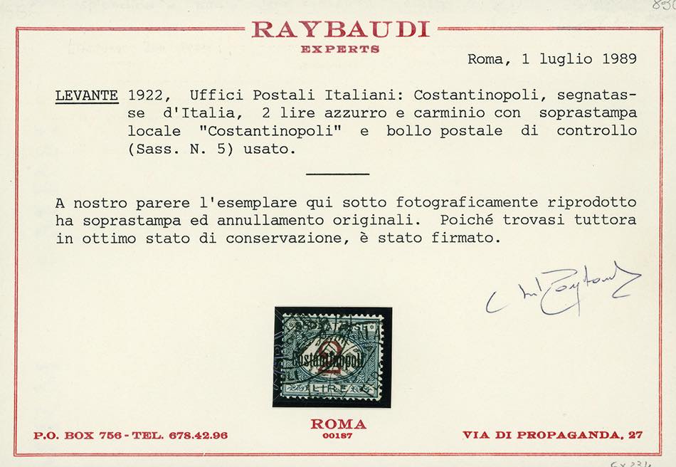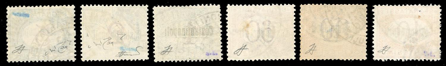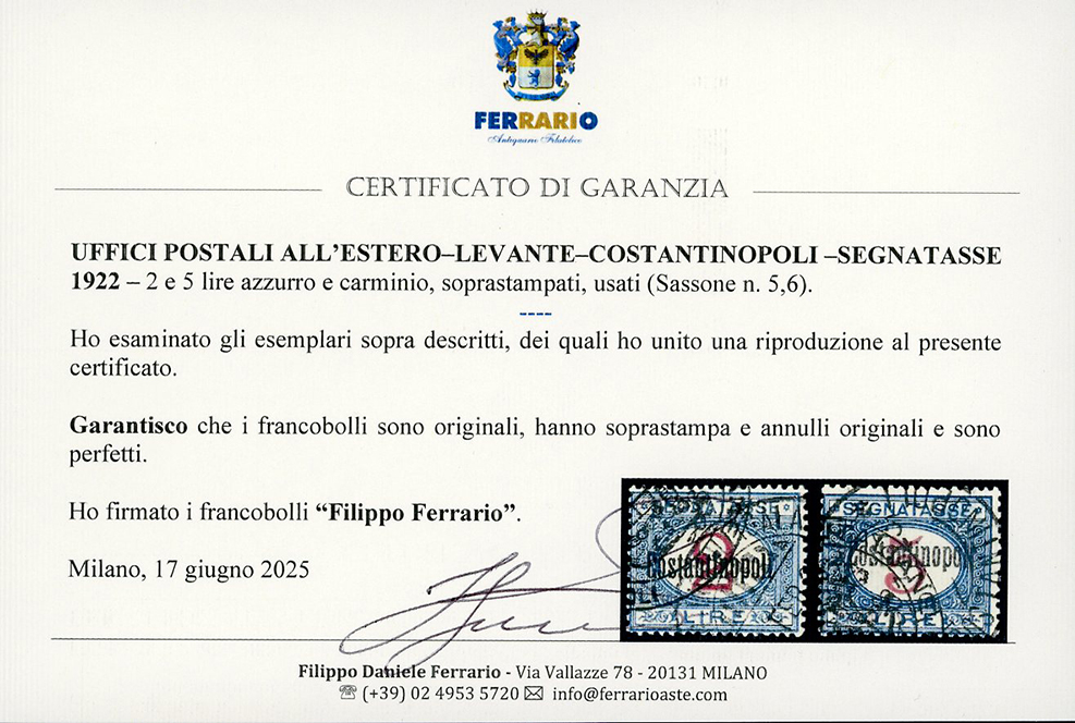 COSTANTINOPOLI SEGNATASSE 1922 - Soprastampati, serie completa (1/6), usati, con annulli originali, perfetti. Cert. Ferrario e Raybaudi per i due alti valori, gli altri firmati Ferrario.