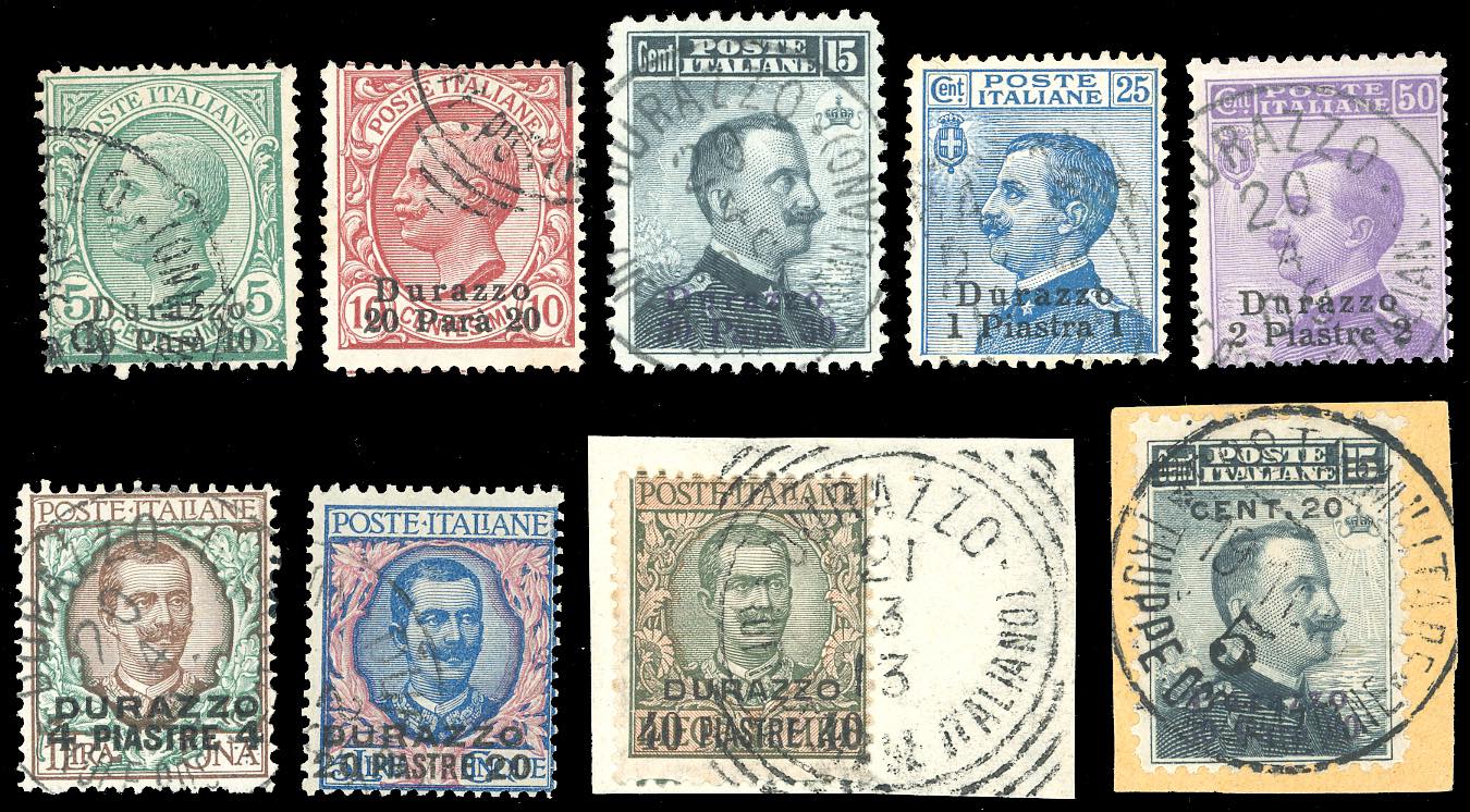 DURAZZO 1909/11 - Soprastampati, tutti i valori emessi (1/8,9), perfetti, usati con annulli originali. Ferrario per gli alti valori, Raybaudi per il n. 8.