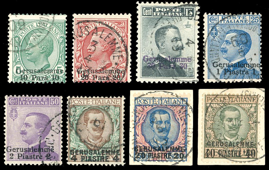 GERUSALEMME 1909/11 - Soprastampati, serie completa (1/8), perfetti, usati con annulli originali. Alti valori cert. Ferrario, gli altri ... Leggi tutto